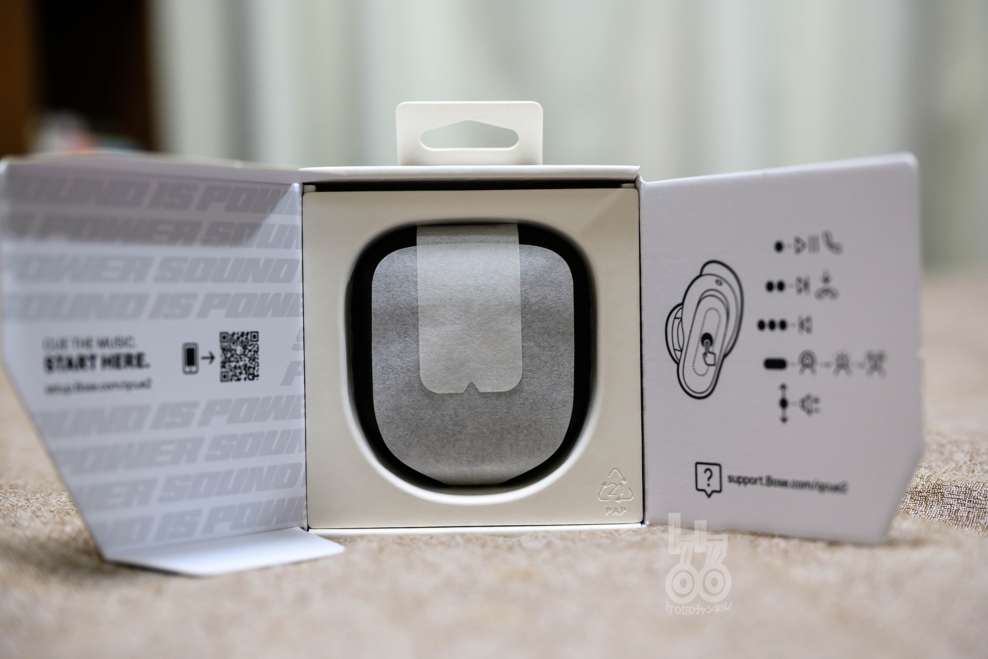 箱を開けるとこんな感じ。説明書を見なくてもここだけで完結します。左のQRコードはアプリへのリンクです。アプリを入れると設定できる機能も増え、音質も変えられるので必ず入れましょう♪