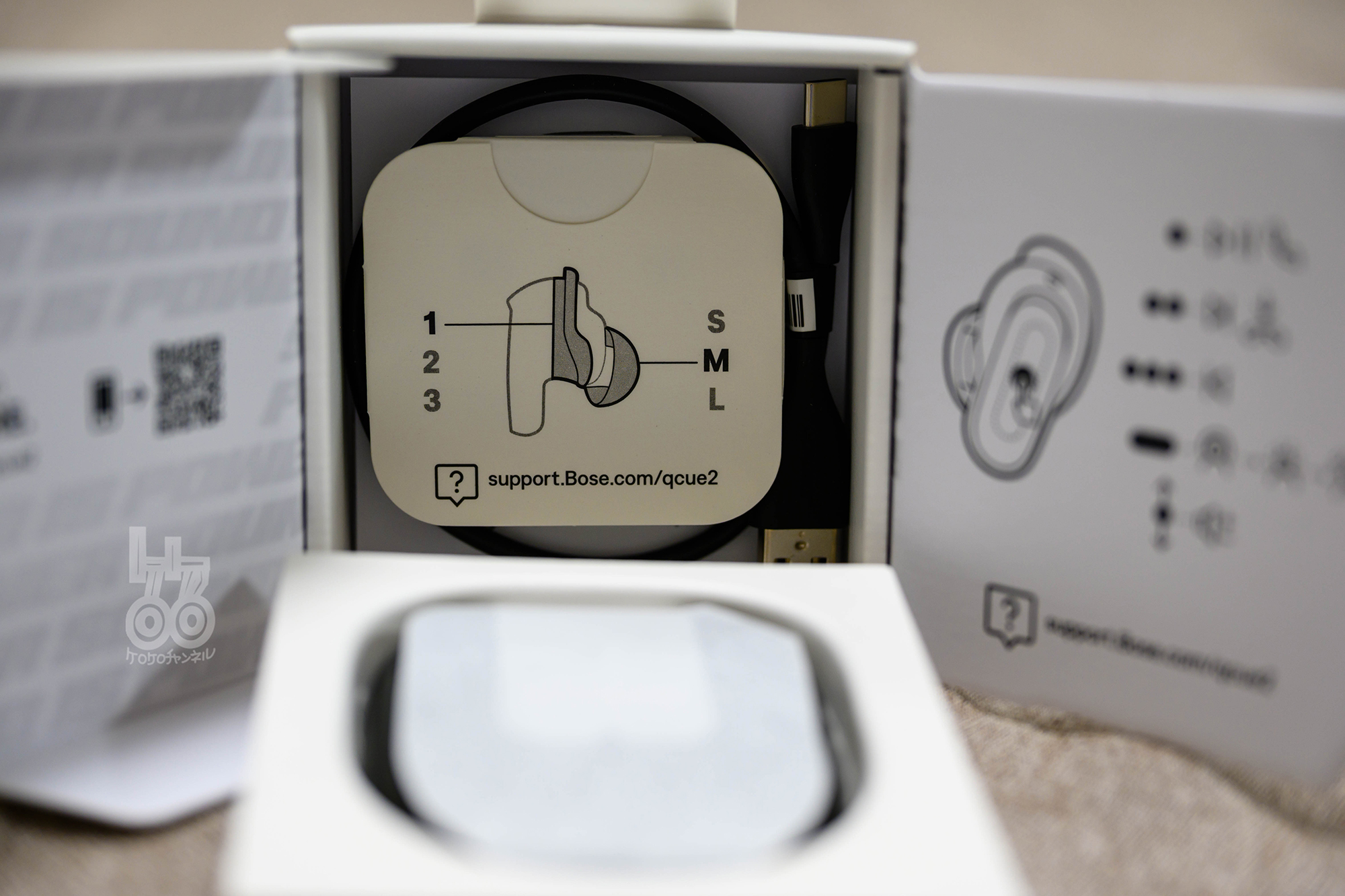 本体を取り出すと予備のイヤーピースやケーブル・注意事項の冊子が入っています。イヤーピースはMサイズでピッタリでした。QuietComfort Earbudsの時にサイズを替えて試しましたけどMサイズがちょうど良かったです。